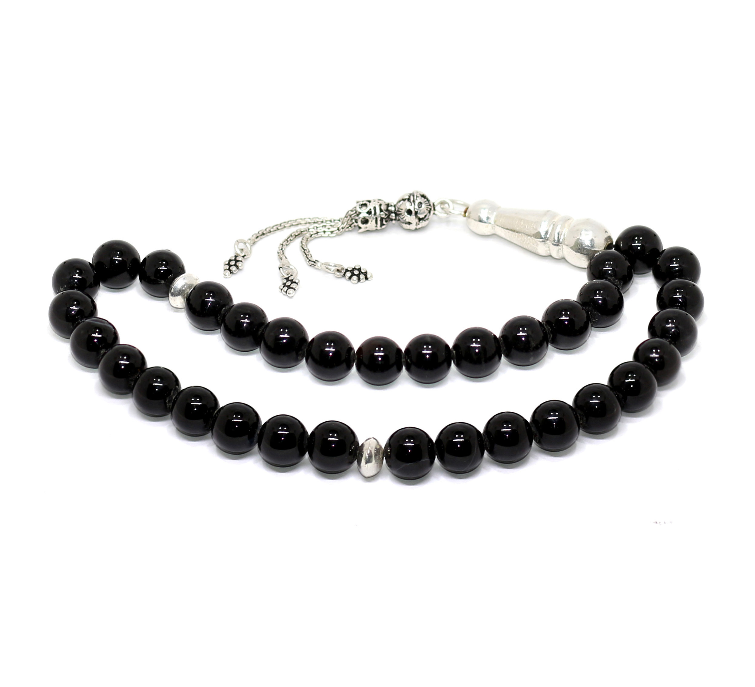 سبحة تحفة 33 حبة جوهرة من حجر اونكس Onyx جزع العقيق الاسود الطبيعي المعروف والمشهور بأنه حجر حماية من الطاقات السلبية – وزن السبحة 90 جرام تقريبا وحجم الحبة 12 مليمتر وفواصل السبحة والمأذنة والشُرابة من الفضة عيار 925 – مرفق مع السبحة شهادة مختومة ومعتمدة من مركزنا