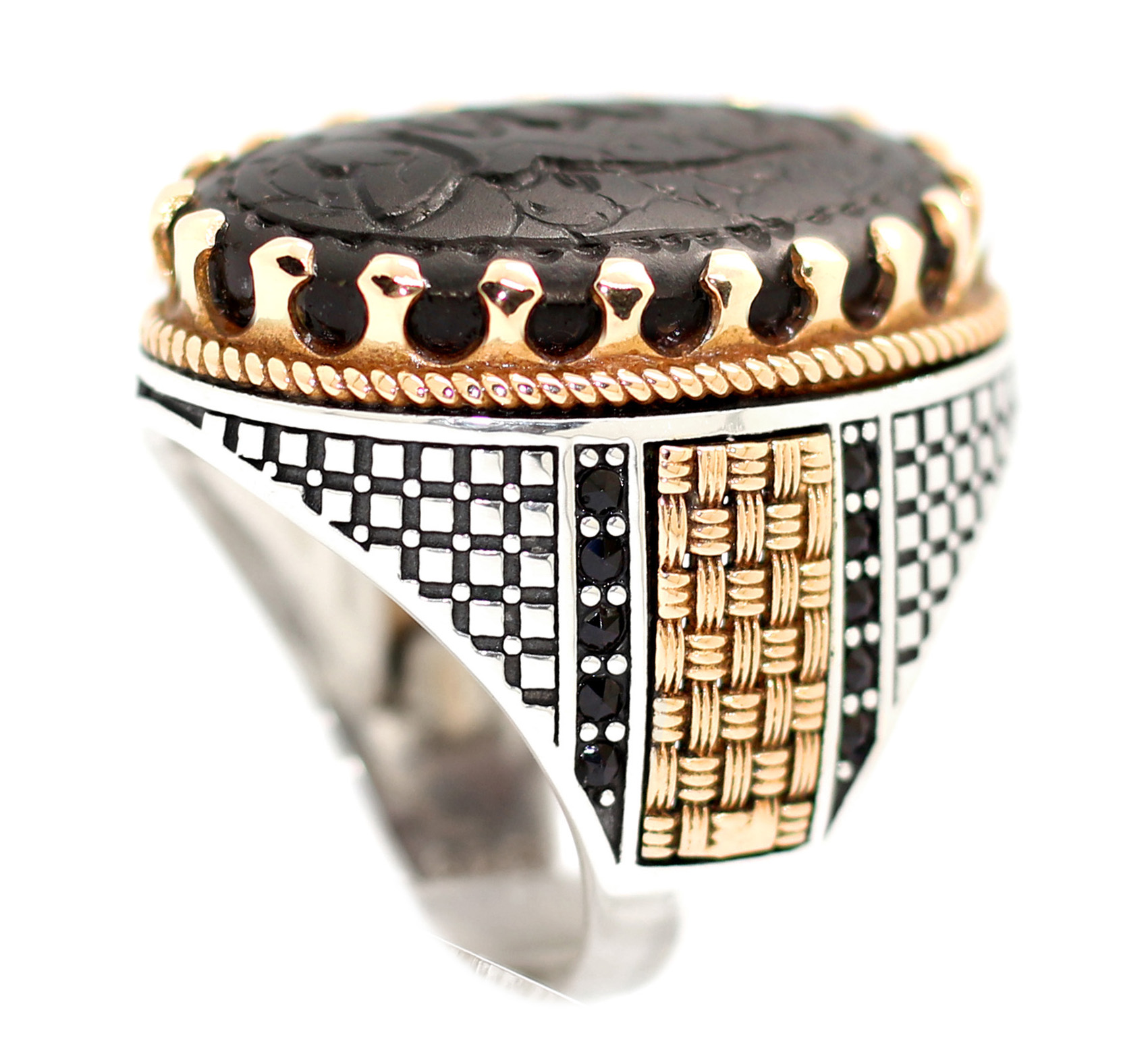 خاتم ملكي من الفضة عيار 925 مطعم بالنحاس الذهبي عالي البريق ومرصع بفصوص الزركون الاحمر ومتوج بجوهرة من الياقوت الأحمر الطبيعي Ruby الحُر بدون أى مُعالجة اطلاقا وزنها 22 قيراط وذات درجة لون وبريق عالي ومميز جدا