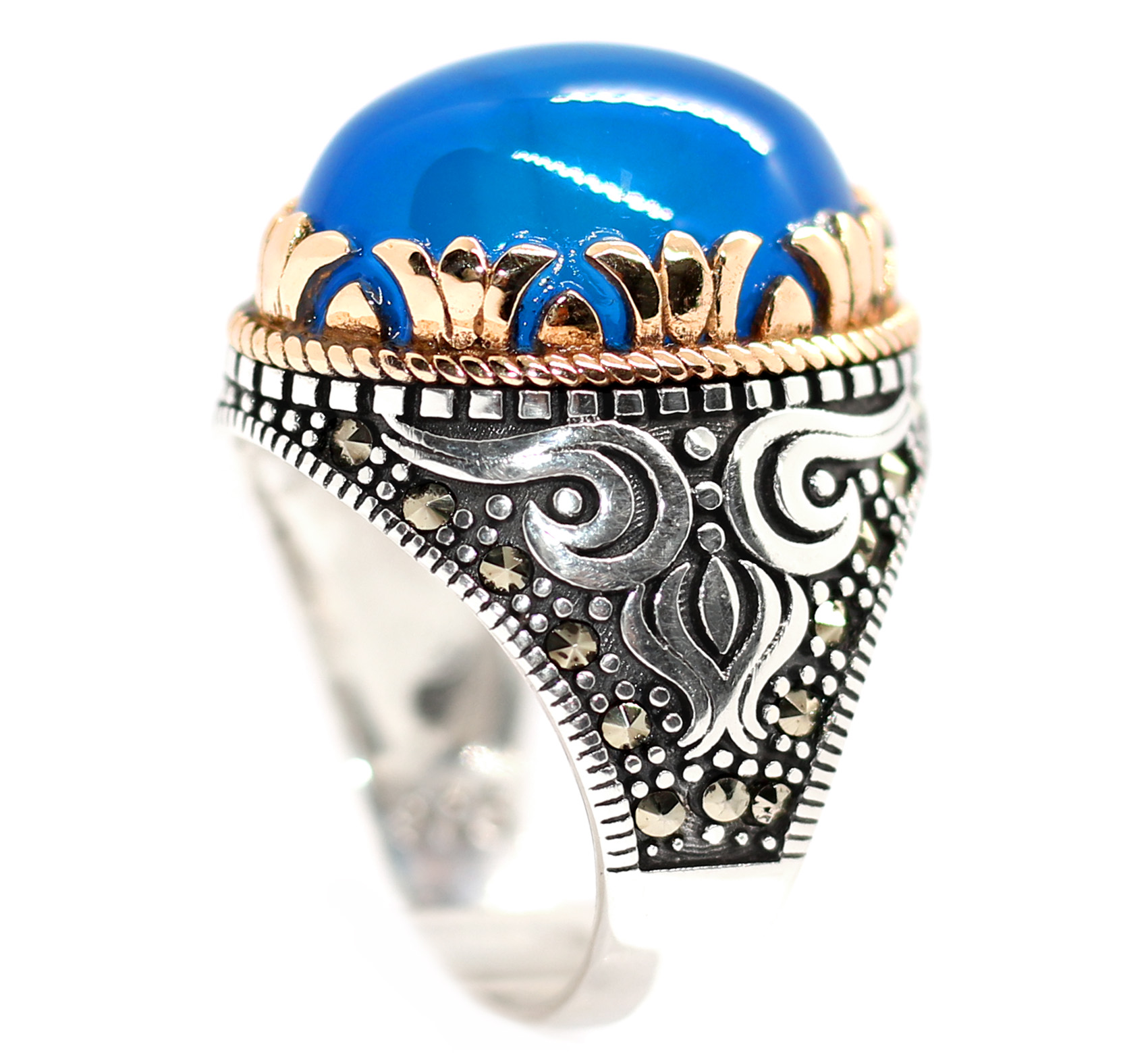 خاتم ملكي تحفة من الفضة عيار 925 مطعم بإطار ذهبي عالي البريق ومرصع بفصوص الزركون السويسري الطبيعي ومتوج بجوهرة من حجر الياقوت الأحمر النجمى الطبيعي الحُــر ruby star – مرفق مع الخاتم شهادة مختومة ومعتمدة من مركزنا