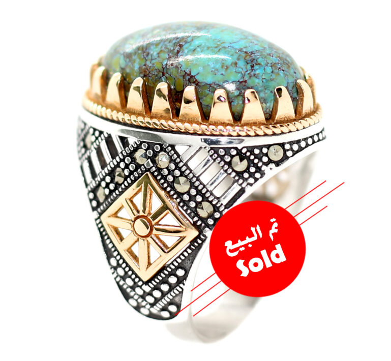 خاتم ملكي تحفة من الفضة عيار 925 مطعم بإطار ذهبي عالي البريق ومرصع بفصوص الماركزيت ومتوج بحجر تحفة ومميز جدا ونادر من الفيروز السيناوي الطبيعي Turquoise المعرق ذات درجات لون نادرة جدا اخضر وازرق طبيعي