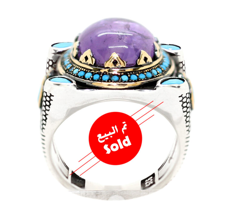 خاتم فضة ملكي عيار 925 مطعم بالنحاس الذهبي ومرصع بفصوص الزركون ومتوج بحجر مميز جدا من حجر الجمشت Amethyst أماتيست عالي البريق المعروف والمشهور بأنه حجر الروح ذات درجة لون مميزة جدا ودرجة نقاء عالية – مرفق مع الخاتم شهادة مختومة بختم موقعنا الرسمي
