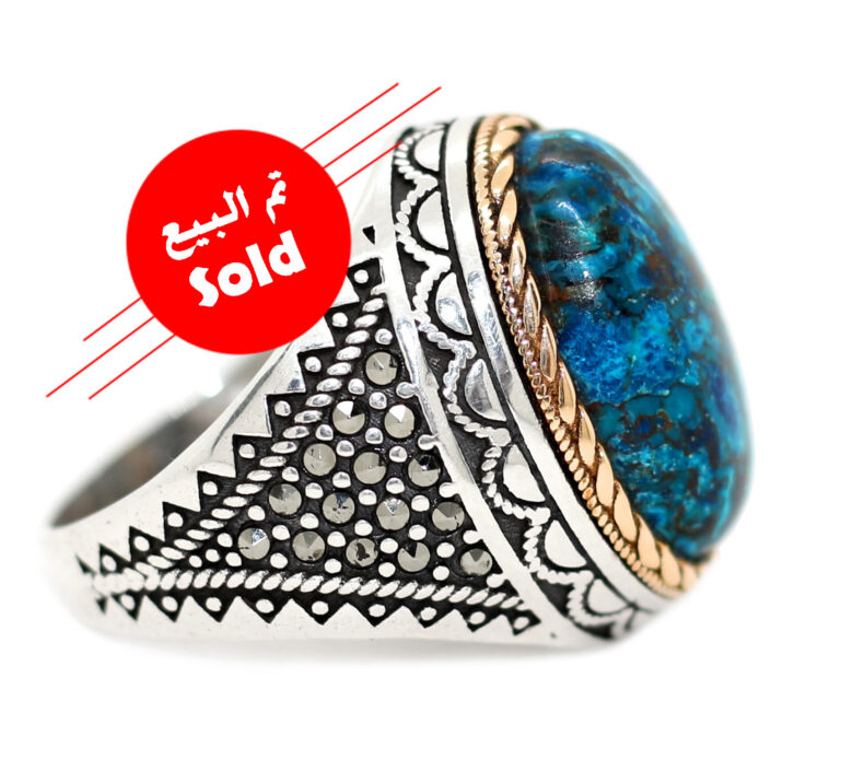 خاتم تحفة من الفضة عيار 925 مطعم بإطار ذهبي عالي البريق ومرصع بفصوص الماركزيت ومتوج بحجر الكريزوكولا Chrysocolla النادر جدا والقديم جدا جدا والمعروف بحجر الحكمة في مصر القديمة