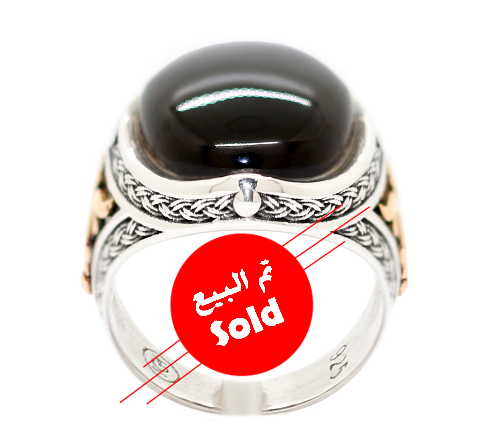 خاتم ملكي تحفة من الفضة عيار 925 مطعم بإطار ذهبي عالي الجودة والبريق ومرصع بفصوص الزركون الاسود ومتوج بفص نادر ومميز من حجر الدُر النجفي الطبيعي البلوري عالي النقاء والبريق محفور عليه آيه الكرسي كاملة بالحفر اليدوي Hand Made والكتابة مطلية بماء الذهب – لأصحاب الذوق الرفيع والروحانيات العالية – مرفق مع الخاتم شهادة مختومة من مركزنا