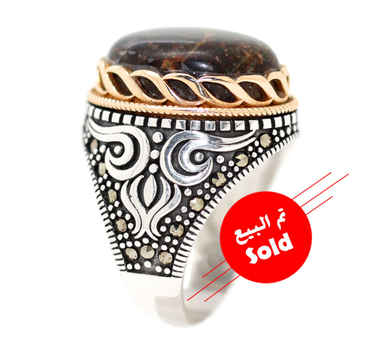 خاتم ملكي تحفة من الفضة عيار 925 مطعم بإطار ذهبي عالي البريق ومرصع بفصوص الماركزيت ومتوج بحجر مميز جدا من النيزك الطبيعي النادر Meteorite المنجذب للمغناطيس وزن 14 قيراط وهو المعروف بإسم حجر السماء وهو الشهاب المذكور فى القرآن الكريم – فَأَتْبَعَهُ شِهَابٌ ثَاقِبٌ – ومعروف ان حامله لا يقربه جان ولا شيطان ولا يؤثر فيه سحر ويُقال ان النيزك هو حجر المراد لأنه عند سقوطه من يراه ويتمنى يتحقق مراده – مرفق مع الخاتم شهادة مختومة بختم موقعنا الرسمي