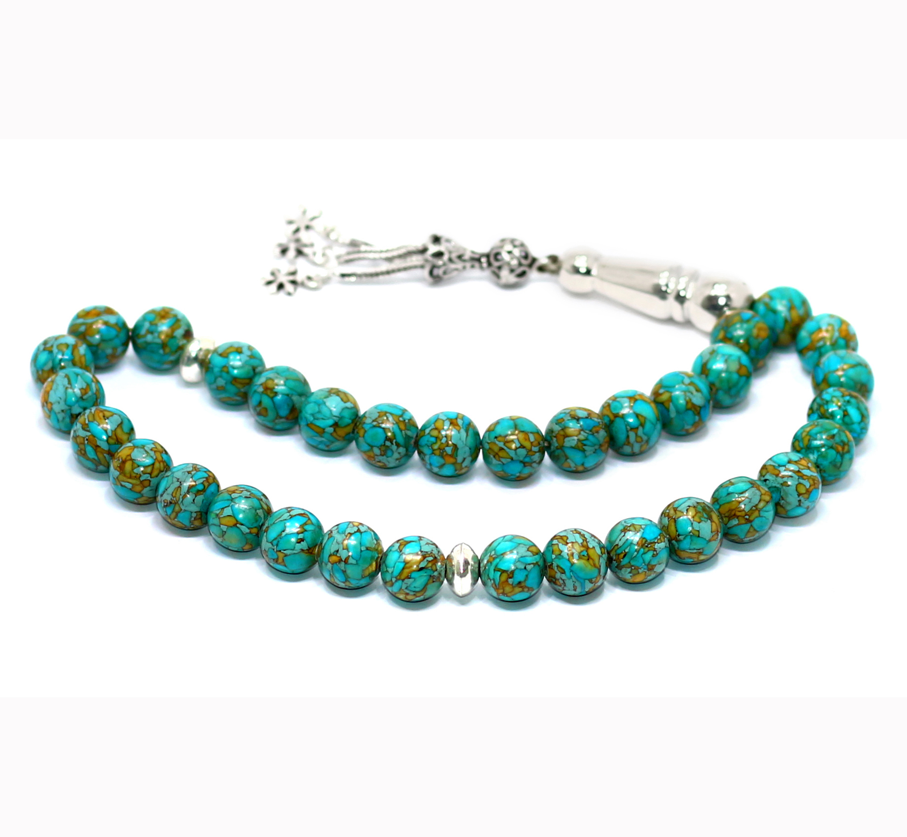 سبحة تحفة 33 حبة من حجر الاكوامارين الطبيعي الحُر Aquamarine وزنها 75 جرام تقريبا وحجم الحبة 10 مليمتر وذات جودة عالية وبريق عالي ونادر ومميز جدا – فواصل السبحة والمأذنة والشُرابة من الفضة عيار 925 – مرفق مع السبحة شهادة مختومة بختم موقعنا الرسمي