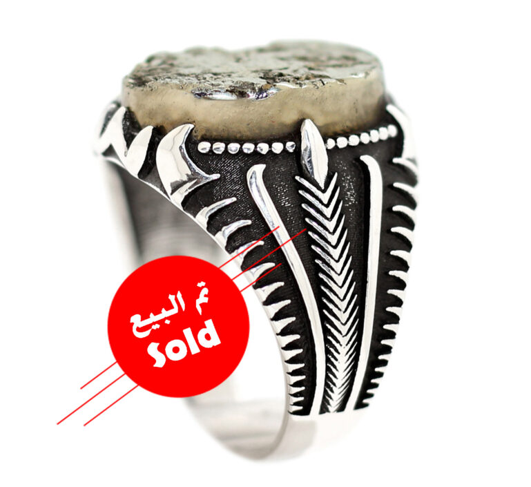 خاتم تحفة من الفضة الإيطالي عيار 925 متوج بحجر مميز جدا من البيريت الذهبي الطبيعي Pyrite وزن 18.6 قيراط من البيريت الحُر الخام Pure المشهور بإسم حجر المال أو حجر النار – والحجر غير مصقول اطلاقا وش الحجر على طبيعته الصخرية الكاملة