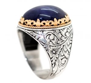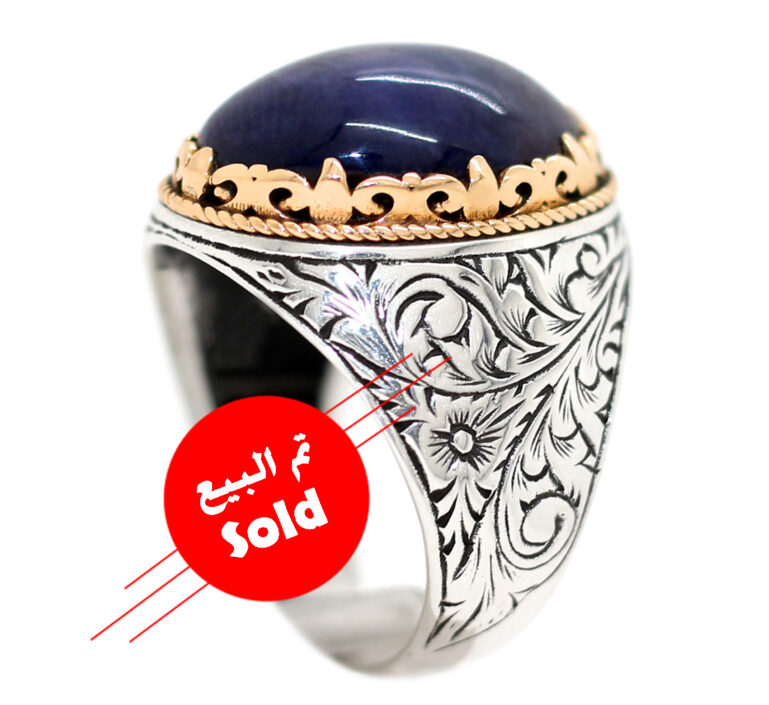 خاتم ملكي من الفضة عيار 925 صياغة Hand Made مطعم بإطار ذهبي عالي البريق ومتوج بجوهرة مميزة جدا من حجر الزفير الأزرق الطبيعي الحُر Sapphire وزن 22 قيراط من الياقوت الأزرق الطبيعي الحُر بدون أي مُعالجة بفضل الله تعالي – مرفق مع الخاتم شهادة مختومة بختم موقعنا الرسمي