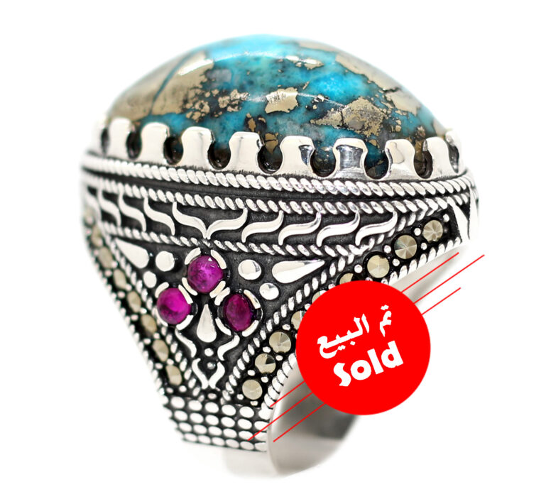 خاتم ملكي من الفضة الإيطالي عيار 925 حجم راهي مرصع بفصوص الماركزيت ومطعم بعدد 6 جواهر من الياقوت الأحمر Ruby ومتوج بحجر كبير ومميز جدا وزنه 41 قيراط من الفيروز النيشابوري الطبيعي المعرق Turquoise المميز جدا المسمي فيروز البيريت لما يحتويه من عروق البيريت الطبيعي Pyrite التي تشبه الذهب المميزة جدا عالية البريق وذات الطاقة العالية المعروف بحجر الثروة والمال
