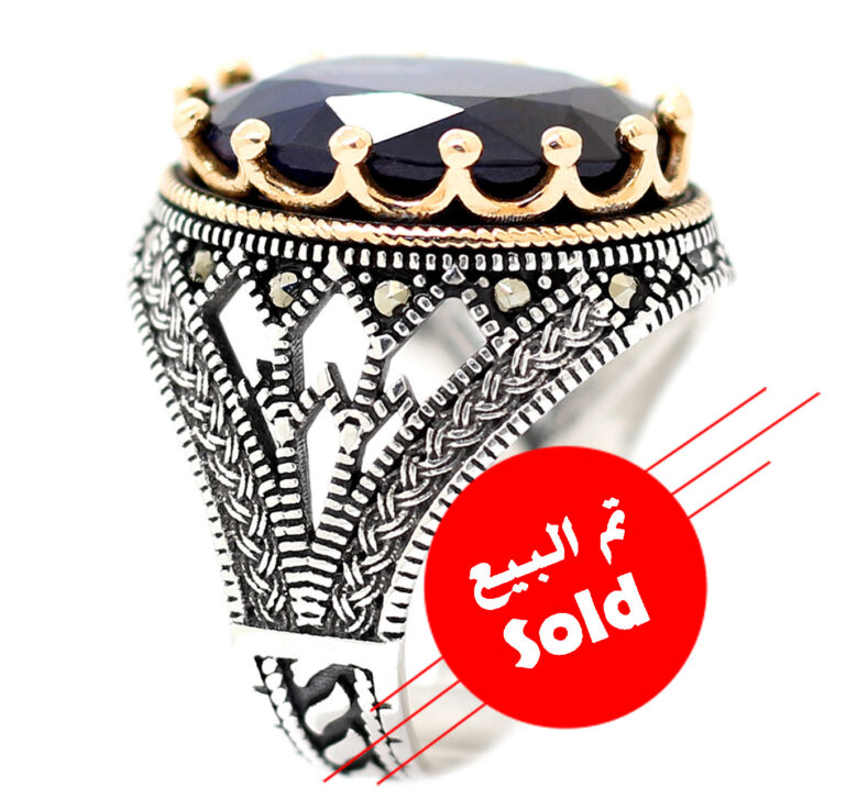 خاتم ملكي تحفة من الفضة عيار 925 مطعم بإطار ذهبي عالي البريق ومرصع بفصوص الماركزيت ومتوج بجوهرة مميزة من حجر الزفير الأزرق الطبيعي Sapphire ياقوت ازرق طبيعي مميز جدا في درجة اللون والنقاء والبريق وزن الحجر 17.7 قيراط – مرفق مع الخاتم شهادة مختومة بختم موقعنا الرسمي