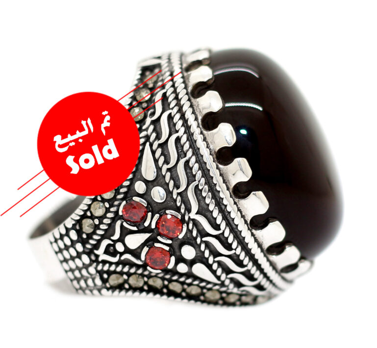 خاتم ملكي تحفة من الفضة الإيطالي عيار 925 حجم راهي مرصع بفصوص الماركزيت والزركون الأحمر ومتوج بحجر كبير ومميز جدا من العقيق شفة العبد اليمني الطبيعي Agate المميز جدا في درجة اللون والبريق والحجر به عرق من الكوارتز الطبيعي Quartz القوي في صد الطاقات السلبية والحماية مما يجعل الحجر نادر جدا ويعتبر حجرين في حجر واحد – مرفق مع الخاتم شهادة مختومة بختم موقعنا الرسمي