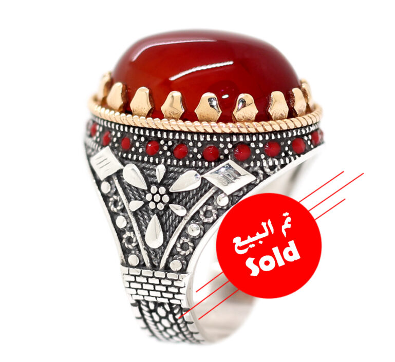 خاتم ملكي من الفضة عيار 925 مطعم بإطار ذهبي عالي البريق لا يتغير لونه ومرصع بفصوص الزركون الأحمر ومتوج بحجر عقيق احمر رماني طبيعي Agate درجة لون دم الغزال المميزة جدا ودرجة نقاء عالية والحجر ذات درجتين لون بشكل طبيعي ونادر جدا ومميز – مرفق مع الخاتم شهادة مختومة بختم موقعنا الرسمي