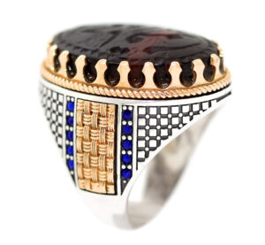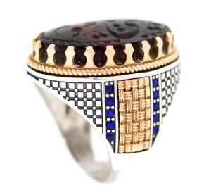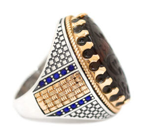 خاتم ملكي كبير من الفضة عيار 925 مطعم بإطار ذهبي عالي البريق لا يتغير لونه ومرصع بفصوص الزركون الأزرق ومتوج بحجر مميز جدا من عقيق شفة العبد الطبيعي Agate المميز جدا منقوش عليه حفرا (يا حي يا قيوم) حجم راهي كبير لأصحاب الذوق الرفيع والروحانيين والمتصوفين وأصحاب أوراد الاسم الأعظم – مرفق مع الخاتم شهادة مختومة بختم موقعنا الرسمي