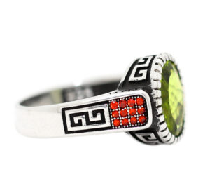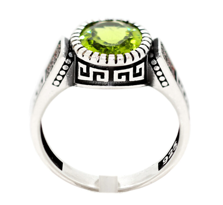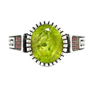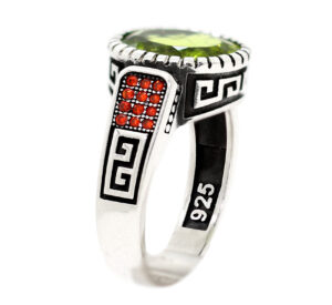 خاتم تحفة من الفضة الإيطالي عيار 925 مرصع بفصوص الزركون الأحمر ومتوج بجوهرة مميزة جدا من حجر الزبرجد الأخضر الطبيعي Peridot عالي الجودة والصلابة بدرجة نقاء AA مميزة جدا – مرفق مع الخاتم شهادة مختومة بختم موقعنا الرسمي