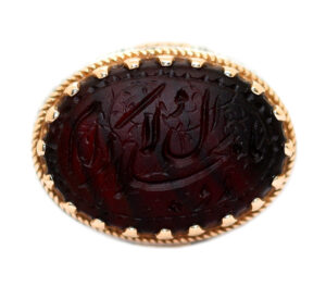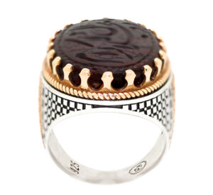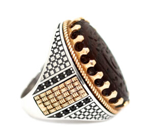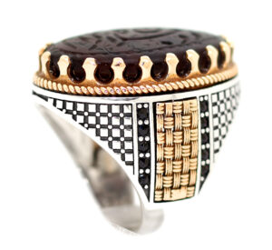 خاتم ملكي من الفضة عيار 925 مطعم بإطار ذهبي عالي البريق لا يتغير لونه ومرصع بفصوص الزركون الأسود ومتوج بحجر مميز جدا من عقيق شفة العبد الطبيعي Agate المميز جدا منقوش عليه حفرا (يا ذو الجلال والإكرام) حجم راهي كبير لأصحاب الذوق الرفيع والروحانيين والمتصوفين وأصحاب أوراد الاسم الأعظم – مرفق مع الخاتم شهادة مختومة بختم موقعنا الرسمي