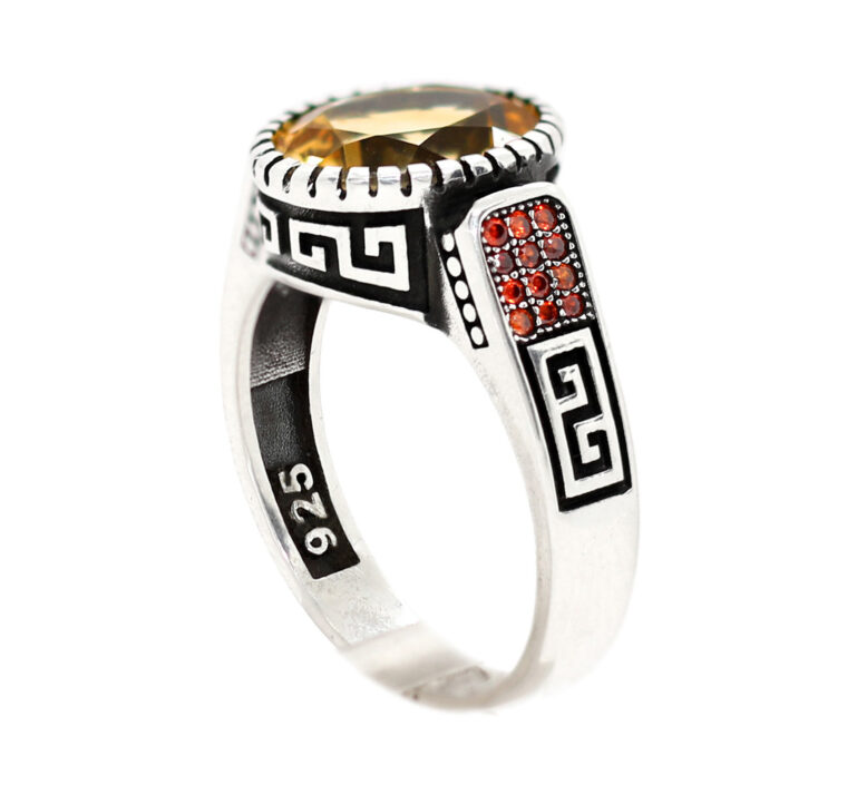 خاتم ملكي من الفضة الإيطالي عيار 925 مرصع بفصوص الزركون ومتوج بجوهرة نادرة وعالية النقاء والبريق والجودة من حجر السترين الذهبي Citrine الطبيعي النادر المعروف بحجر الثروة بدرجة نقاء AAA عالية جدا – مرفق مع الخاتم شهادة مختومة بختم موقعنا الرسمي