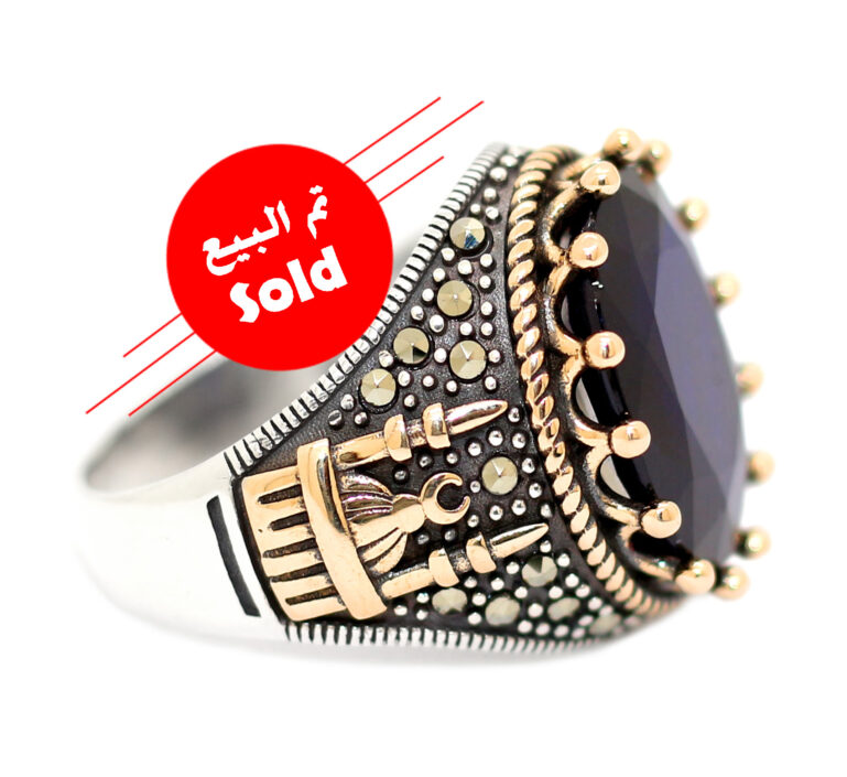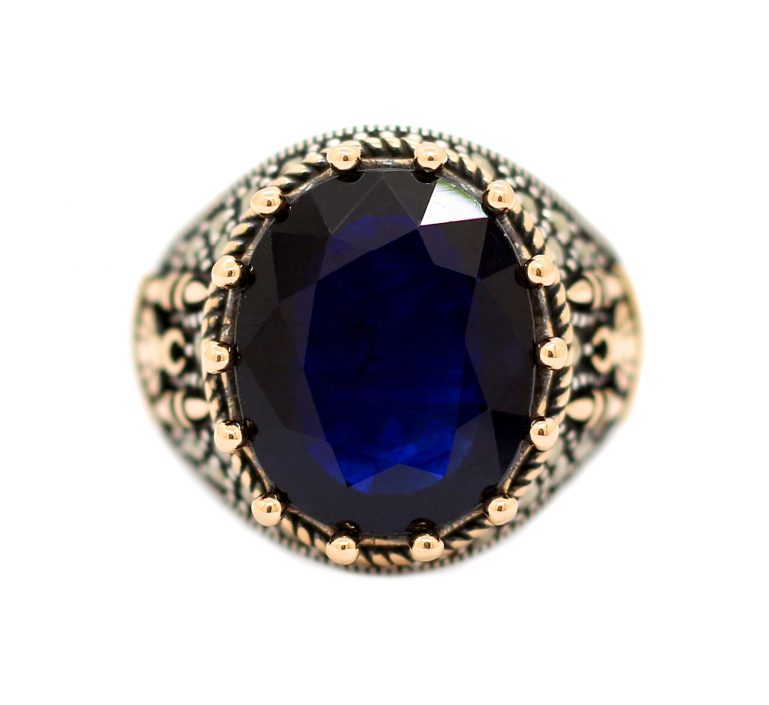خاتم ملكي تحفة من الفضة عيار 925 مطعم بإطار ذهبي عالي البريق ومرصع بفصوص الماركزيت ومتوج بجوهرة مميزة من حجر الزفير الأزرق الطبيعي Sapphire ياقوت ازرق طبيعي مميز جدا في درجة اللون والنقاء والبريق وزن الحجر 12.5 قيراط