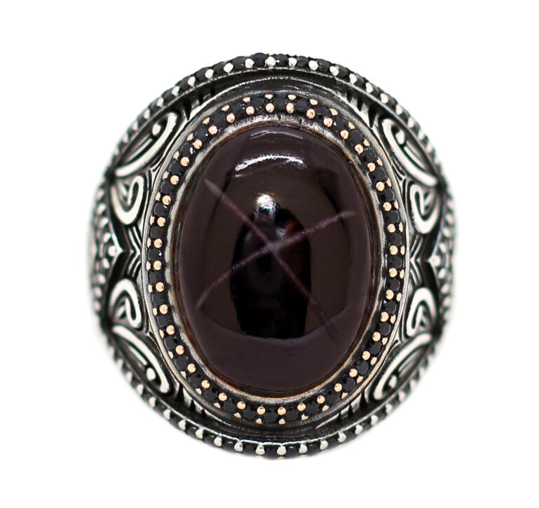 خاتم ملكي تحفة من الفضة عيار 925 مرصع بفصوص الزركون الأسود ومتوج بجوهرة مميزة جدا من حجر الجارنيت الأحمر النجمي الطبيعي Garnet Star ذات درجة لون مميزة جدا ورائعة وذات بريق نجمي واضح وصريح وزنها 15.5 قيراط – مرفق مع الخاتم شهادة مختومة بختم موقعنا الرسمي