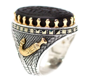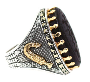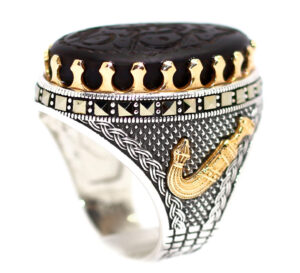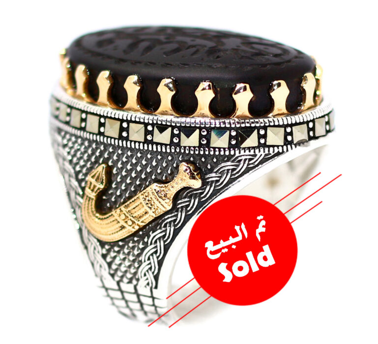 خاتم ملكي من الفضة عيار 925 حجم راهي مطعم بإطار ذهبي عالي البريق لا يتغير لونه ومرصع بفصوص الماركزيت ومتوج بحجر مميز جدا من عقيق شفة العبد الطبيعي Agate المميز جدا منقوش عليه حفرا (يا حي يا قيوم) حجم راهي كبير لأصحاب الذوق الرفيع والروحانيين والمتصوفين وأصحاب أوراد الاسم الأعظم – مرفق مع الخاتم شهادة مختومة بختم موقعنا الرسمي
