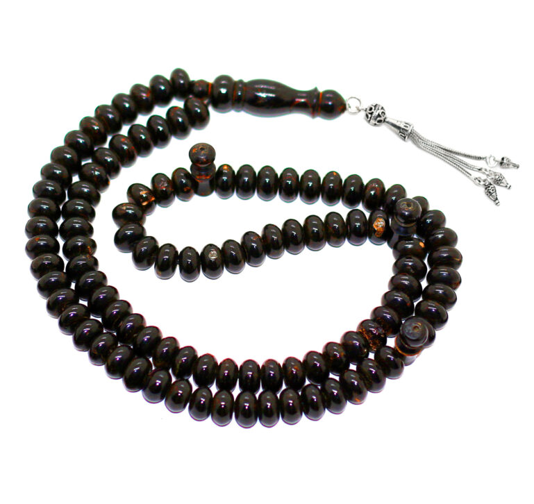 سبحة 100 حبة من اليُسر الحجازي الطبيعي المعرق بعروق ذهبية وهو حجر اليُسر الكريم الطبيعي المستخرج من البحر الأحمر Black coral المرجان الأسود الطبيعي هو افضل أنواع اليُسر على الاطلاق في العالم – لهواة الروحانيات العالية والبركات – وزن السبحة 55 جرام تقريبا حجم الحبة 10 مليمتر