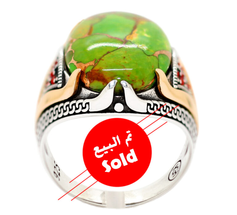 خاتم ملكي تحفة من الفضة عيار 925 مطعم بإطار ذهبي عالي البريق لا يتغير لونه ومرصع بفصوص الزركون ومتوج بحجر من الفيروز الأخضر التفاحي الطبيعي Turquoise المميز جدا – لأصحاب الذوق الرفيع والنوادر