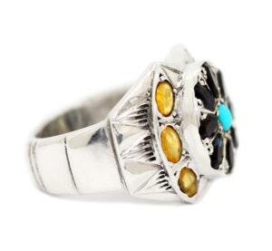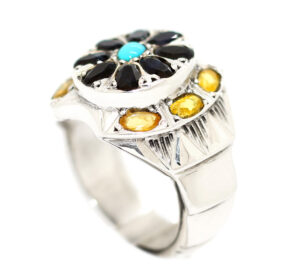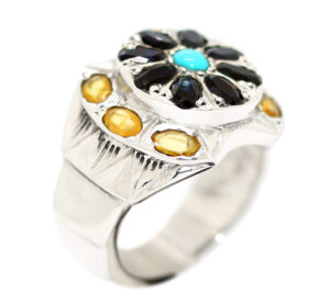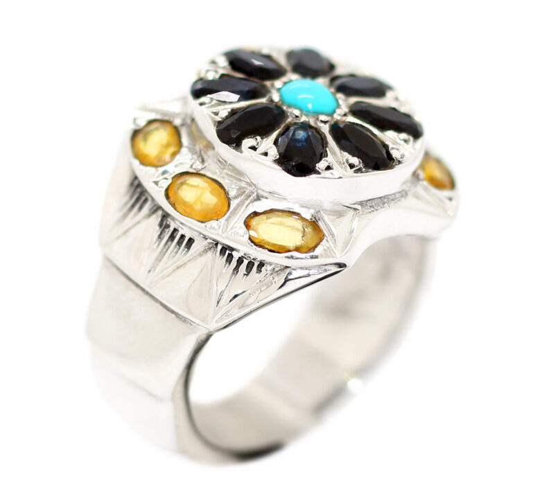 خاتم ملكي تحفة من الفضة الإيراني الثقيلة عيار 925 تصميم وصياغة Hand Made مرصع بعدد 6 جواهر من الزفير الأصفر الطبيعي Yellow Sapphire ويعلوه 8 جواهر من الزفير الأزرق الطبيعي Blue Sapphire المميز جدا ويزينه في المنتصف حجر فيروز نيشابوري رائع اللون والصفاء – مرفق مع الخاتم شهادة مختومة بختم موقعنا الرسمي