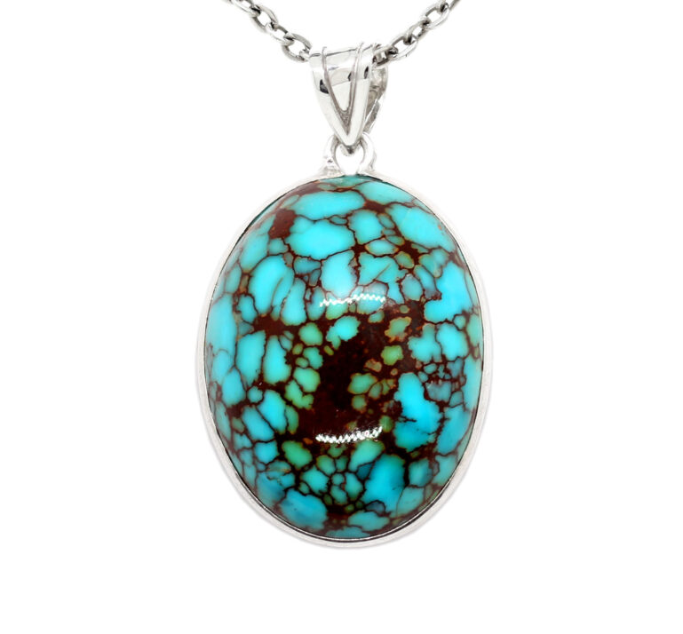 قلادة تحفة بإطار من الفضة الإيطالي عيار 925 تصميم وصياغة Hand Made متوجة بقطعة كبيرة ومميزة جدا من حجر الفيروز السيناوي الطبيعي المعرق Turquoise عالي الجودة ودرجة اللون من فيروز سانت كاترين المعروف والمشهور ببركته وفوائده التي لا تعد ولا تحصي – وزن الحجر 80 قيراط