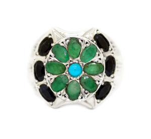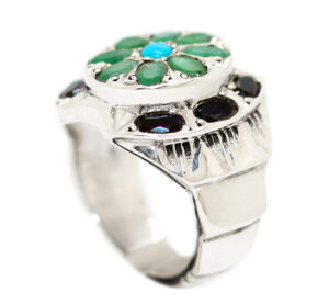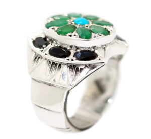 خاتم ملكي تحفة من الفضة الإيراني الثقيلة عيار 925 تصميم وصياغة Hand Made متوج بعدد 8 جواهر من الزمرد الطبيعي Emerald ومرصع بعدد 6 جواهر من الزفير الأزرق الطبيعي Sapphire المميز جدا ويزينه في المنتصف حجر فيروز نيشابوري رائع اللون والصفاء – مرفق مع الخاتم شهادة مختومة بختم موقعنا الرسمي