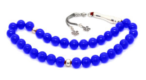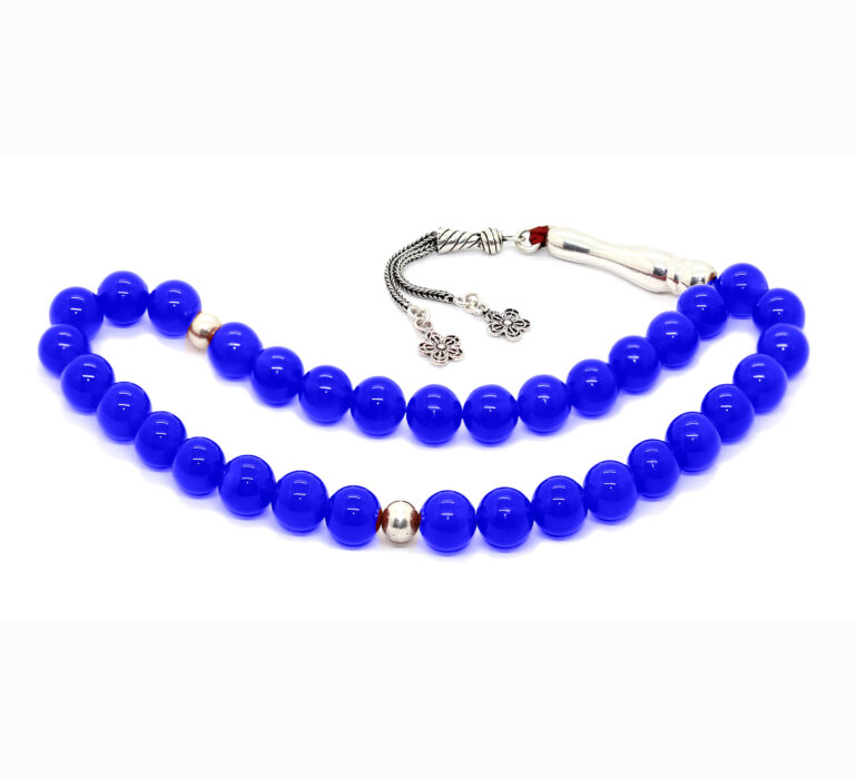 سبحة تحفة 33 حبة من حجر اليشم الأزرق الطبيعي Jade المعروف والمشهور بإسم حجر الجنة – حجم الحبة 10 مليمتر – شُرابة السبحة والفواصل والمأذنة من الفضة عيار 925 – وزن السبحة حوالي 60 جرام – مرفق مع السبحة شهادة مختومة بختم موقعنا الرسمي