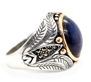 خاتم تحفة من الفضة الإيطالي عيار 925 مرصع بفصوص الماركزيت ومتوج بجوهرة مميزة من حجر الزفير الأزرق الطبيعي الحُر Sapphire ياقوت ازرق طبيعي حُر عالي البريق بدون أي مُعالجة أو تحسين إطلاقا – وزن الحجر 14.4 قيراط – مرفق مع الخاتم شهادة مختومة بختم موقعنا الرسمي