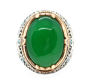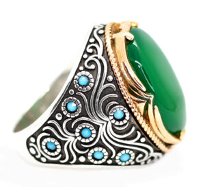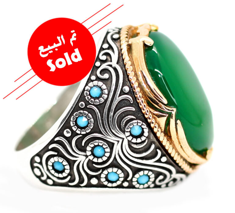 خاتم ملكي تحفة من الفضة عيار 925 مطعم بإطار ذهبي عالي البريق مصمم على شكل سيف ذو الفقار (سيف الإمام على رضي الله عنه وأرضاه) ومرصع بفصوص الزركون ومتوج بحجر مميز جدا من العقيق الأخضر الطبيعي Agate ذات درجة لون مميزة جدا ودرجة نقاء عالية – مرفق مع الخاتم شهادة مختومة بختم موقعنا الرسمي