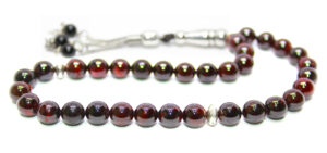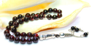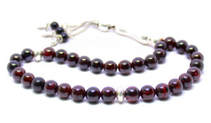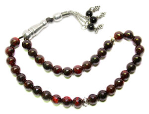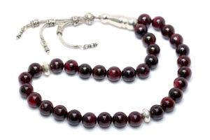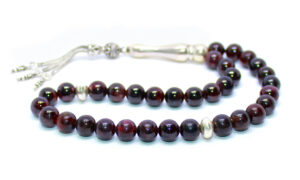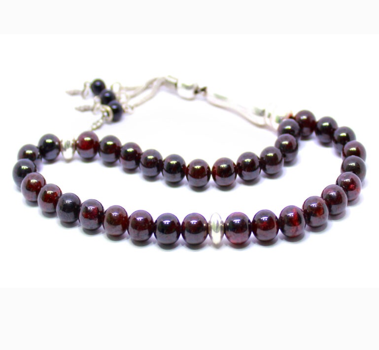 سبحة 33 حبة تحفة من حجر الجارنيت الأحمر الطبيعي المميز Garnet المشهور بإسم ياقوت الجارنيت أو حب الرمان – حجم الحبة 10 ملمتر والسبحة مطعمة بالفضة شُرابة السبحة والمأذنة والشواهد من الفضة عيار 925 – مرفق مع السبحة شهادة مختومة بختم موقعنا الرسمي