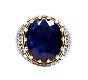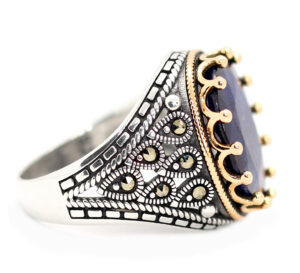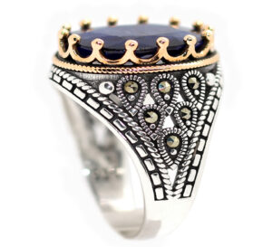 خاتم ملكي تحفة من الفضة عيار 925 مطعم بإطار ذهبي عالي البريق ومرصع بفصوص الماركزيت ومتوج بجوهرة مميزة من حجر الزفير الأزرق الطبيعي Sapphire ياقوت ازرق طبيعي مميز جدا في درجة اللون والبريق العالي النادر المميز جدا وزن الحجر 12.5 قيراط