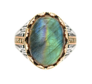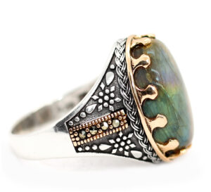 خاتم تحفة من الفضة الإيطالي عيار 925 مطعم بإطار ذهبي عالي البريق ومرصع بفصوص الماركزيت ومتوج بجوهرة مميزة جدا وعالية البريق من حجر الطاووس الطبيعي Labradorite المميز جدا متقلب الألوان Full Fire والمشهور بأنه يجمع الوان الطيف السبعة في حجر واحد ويسمي أيضا حجر القمر الأسود