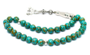 سبحة تحفة 33 حبة ومميزة جدا من حجر الفيروز الطبيعي المضغوط Turquoise الفيروز الأزرق الطبيعي والفيروز الأخضر النادر الطبيعي – حجم حبة الفيروز 10 مليمتر تقريبا – شُرابة السبحة والمأذنة والفواصل من الفضة عيار 925