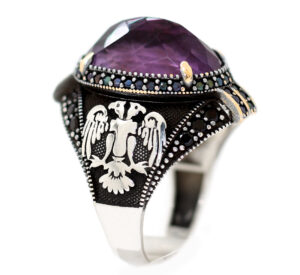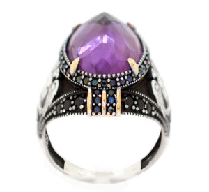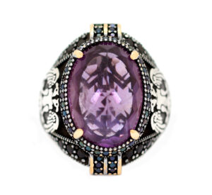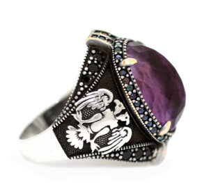 خاتم ملكي من الفضة الإيطالي عيار 925 مرصع بفصوص الزركون الأسود ومتوج بجوهرة مميزة جدا من حجر الجمشت الطبيعي Amethyst أماتيست أرجواني عالي البريق المعروف والمشهور بأنه حجر الروح ذات درجة لون مميزة جدا ودرجة نقاء AAA عالية جدا وزن 10.85 قيراط – مرفق مع الخاتم شهادة مختومة بختم موقعنا الرسمي