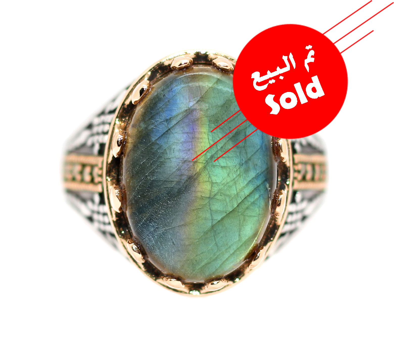 • خاتم حجر الطاووس الطبيعي Labradorite عالي البريق