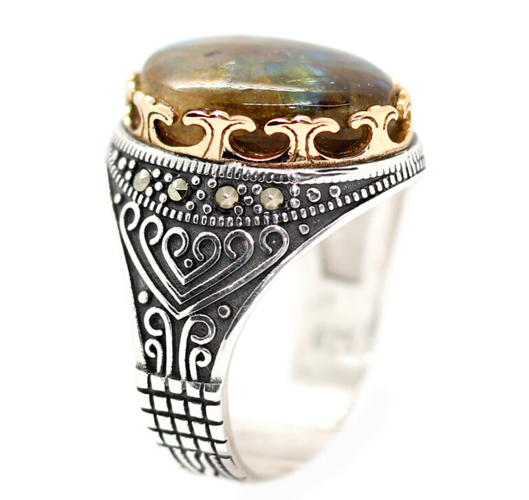 خاتم تحفة من الفضة عيار 925 مطعم بإطار ذهبي عالي البريق ومرصع بفصوص الماركزيت ومتوج بجوهرة مميزة جدا وعالية البريق من حجر الطاووس الطبيعي Labradorite المميز جدا متقلب الألوان Full Fire والمشهور بأنه يجمع الوان الطيف السبعة في حجر واحد ويسمي أيضا حجر القمر الأسود
