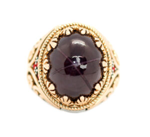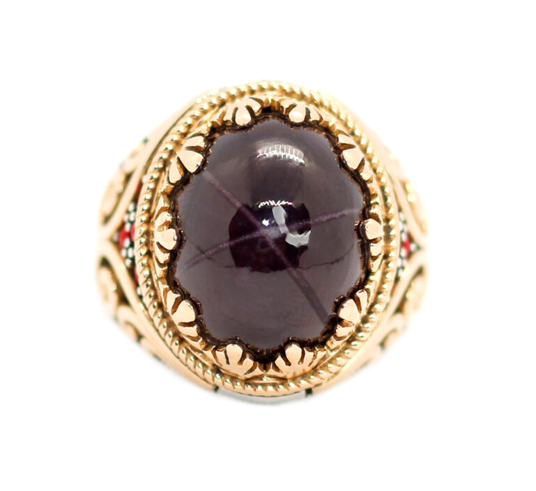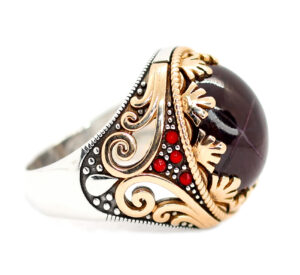 خاتم ملكي تحفة من الفضة عيار 925 مطعم بإطار ذهبي عالي البريق ومرصع بفصوص الزركون الأحمر ومتوج بجوهرة مميزة جدا من حجر الجارنيت الأحمر النجمي الطبيعي الحُر Garnet Star ذات درجة لون مميزة جدا ورائعة وذات بريق نجمي واضح وصريح جدا ونادر وزنها 23 قيراط – مرفق مع الخاتم شهادة مختومة بختم موقعنا الرسمي