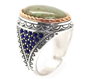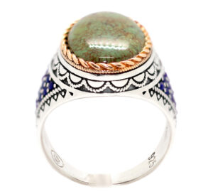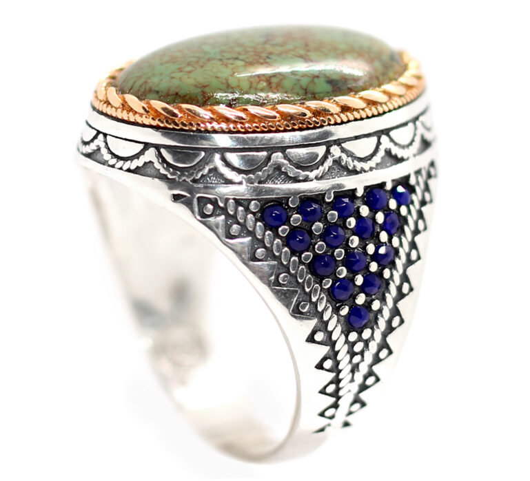 خاتم ملكي تحفة من الفضة عيار 925 مطعم بإطار ذهبي عالي البريق ومرصع بفصوص الزركون الأزرق ومتوج بحجر مميز جدا ونادر من الفيروز السيناوي الأخضر الطبيعي المعرق Turquoise من فيروز سانت كاترين عالي الجودة – لأصحاب الذوق الرفيع والنوادر