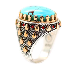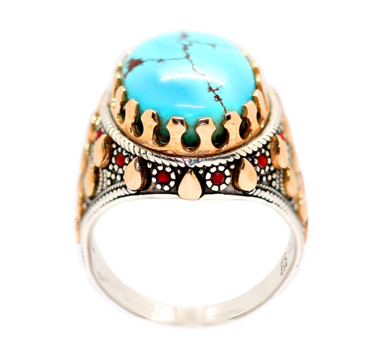 خاتم ملكي من الفضة عيار 925 مطعم بإطار ذهبي عالي البريق ومرصع بفصوص الزركون الأحمر ومتوج بحجر تحفة من الفيروز السيناوي الطبيعي المعرق Turquoise المميز جدا في درجة اللون والجودة العالية