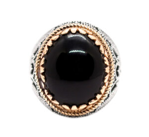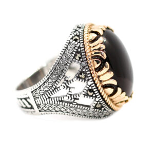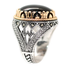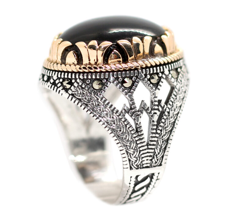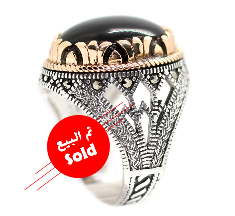 خاتم ملكي تحفة من الفضة عيار 925 مطعم بإطار ذهبي عالي البريق ومرصع بفصوص الماركزيت ومتوج بحجر التورمالين الأسود الطبيعي الحُر Black Tourmaline عالي الجودة المعروف والمشهور بإسم حجر الطاقات الشفائية – وزن الحجر 12 قيراط – مرفق مع الخاتم شهادة مختومة بختم موقعنا الرسمي