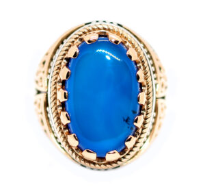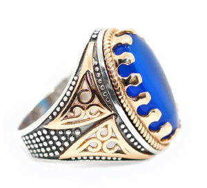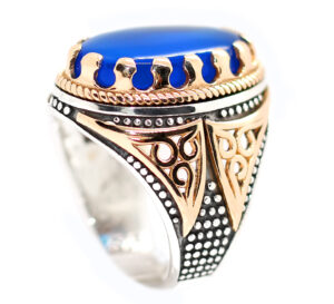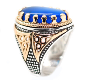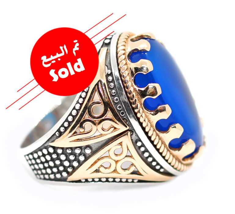 خاتم ملكي تحفة من الفضة عيار 925 مطعم بإطار ذهبي عالي البريق ومتوج بحجر مميز جدا وعالي الجودة والبريق والنقاء من العقيق الأزرق الطبيعي النادر Agate اندر أنواع العقيق هو العقيق الأزرق أو العقيق الملكي – مرفق مع الخاتم شهادة مختومة بختم موقعنا الرسمي