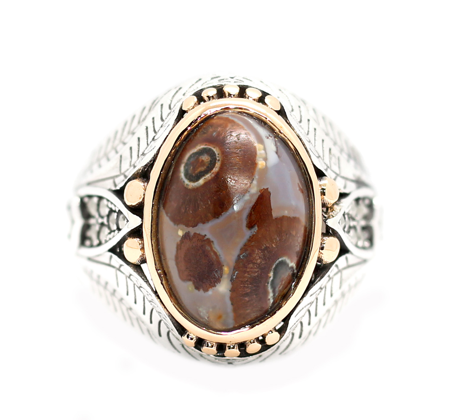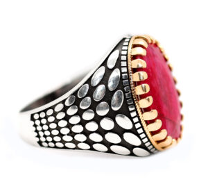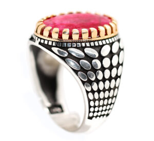 خاتم ملكي تحفة من الفضة عيار 925 مطعم بإطار ذهبي عالي البريق ومتوج بجوهرة من الياقوت الأحمر الطبيعي Ruby (ياقوت كشمير الهندي) وزن 8.5 قيراط ذات درجة لون مميزة – مرفق مع الخاتم شهادة مختومة بختم موقعنا الرسمي