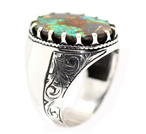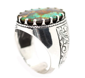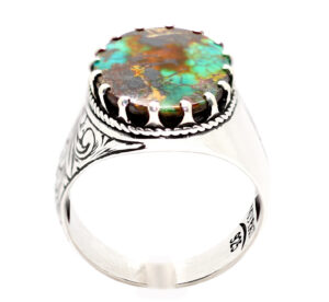 خاتم ملكي تحفة من الفضة الإيطالي عيار 925 تصميم وصياغة Hand Made متوج بحجر مميز جدا من الفيروز النيشابوري الطبيعي المعرق Turquoise عالي الجودة واللون والبريق والحجر نادر ومنجذب للمغناطيس بشكل طبيعي