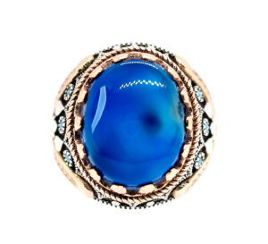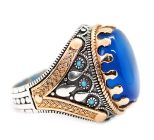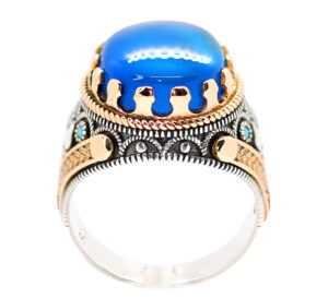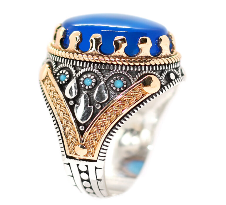 خاتم ملكي تحفة من الفضة عيار 925 مطعم بإطار ذهبي عالي البريق ومرصع بفصوص الزركون ومتوج بحجر مميز جدا وعالي الجودة والبريق والنقاء من العقيق الأزرق الطبيعي النادر Agate اندر أنواع العقيق هو العقيق الأزرق أو العقيق الملكي – مرفق مع الخاتم شهادة مختومة بختم موقعنا الرسمي