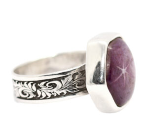 خاتم ملكي تحفة من الفضة الإيطالي عيار 925 تصميم وصياغة Hand Made متوج بجوهرة من حجر الياقوت النجمي الطبيعي الحُــر Ruby Star المميز جدا وزن 21.5 قيراط – مرفق مع الخاتم شهادة مختومة بختم موقعنا الرسمي