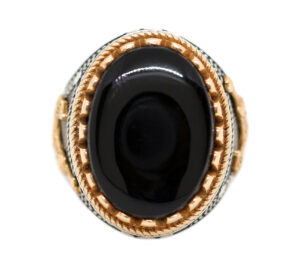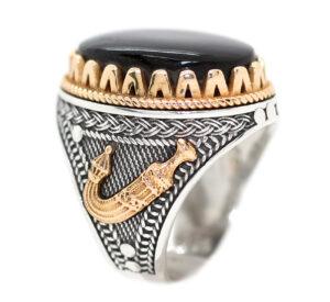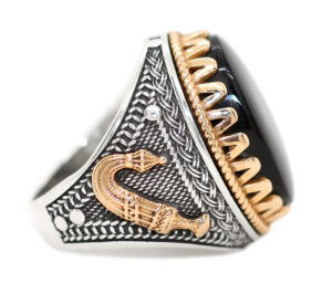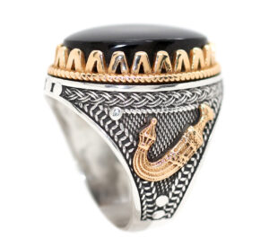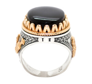 خاتم ملكي تحفة من الفضة عيار 925 مطعم بإطار ذهبي عالي البريق ومتوج بحجر التورمالين الأسود الطبيعي الحُر Black Tourmaline عالي الجودة المعروف والمشهور بإسم حجر الطاقات الشفائية – وزن الحجر 18 قيراط – مرفق مع الخاتم شهادة مختومة بختم موقعنا الرسمي