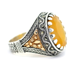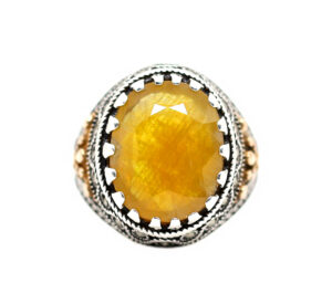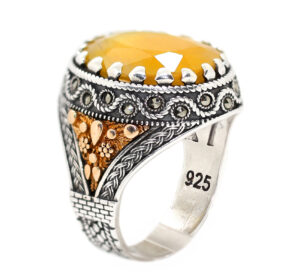 خاتم ملكي من الفضة الإيطالي عيار 925 مرصع بفصوص الماركزيت ومتوج بجوهرة مميزة جدا من الزفير الأصفر الطبيعي Yellow Sapphire ياقوت أصفر طبيعي ذات بريق عالي ودرجة نقاء عالية وزن حجر الزفير 12 قيراط تقريبا – مرفق مع الخاتم شهادة مختومة بختم موقعنا الرسمي