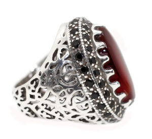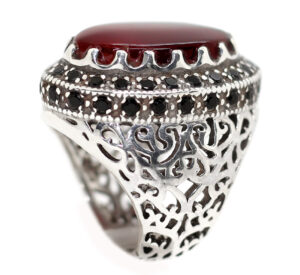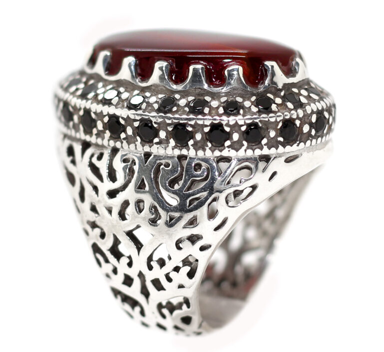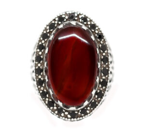 خاتم ملكي تحفة حجم راهي من الفضة عيار 925 تصميم Hand Made صياغة ثقيلة ومرصع بفصوص الزركون الأسود ومتوج بحجر مميز جدا من العقيق الأحمر اليمني الطبيعي Agate الزعفراني ذات درجة لون مميزة جدا ودرجة نقاء عالية