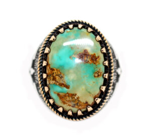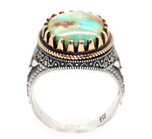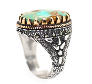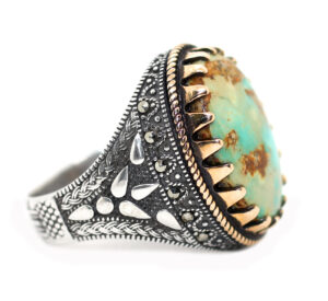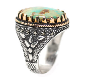 خاتم ملكي تحفة من الفضة عيار 925 مطعم بإطار ذهبي عالي البريق ومرصع بفصوص الماركزيت ومتوج بحجر مميز جدا من الفيروز النيشابوري الأخضر الطبيعي Turquoise عالي الجودة واللون والبريق كأنه لوحة فنية – سبحان الخالق العظيم